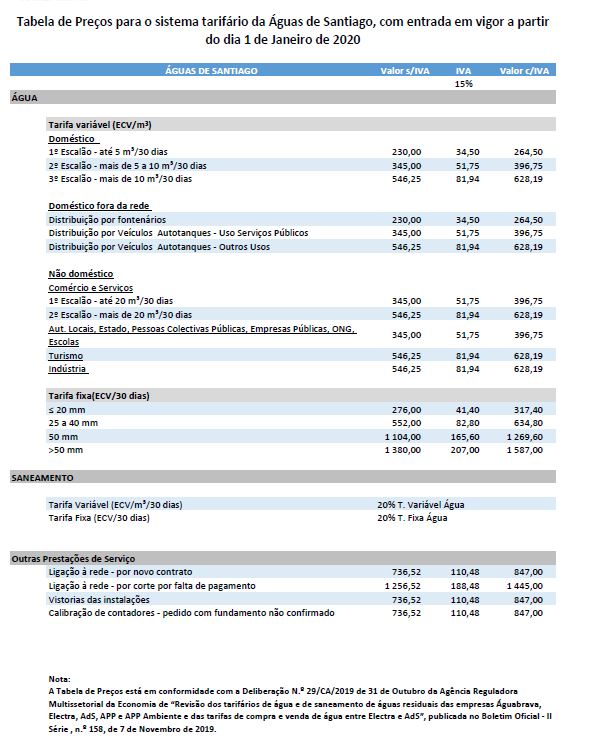 Nova tabela Tarifária em vigor a partir de 1 de Janeiro de 2020