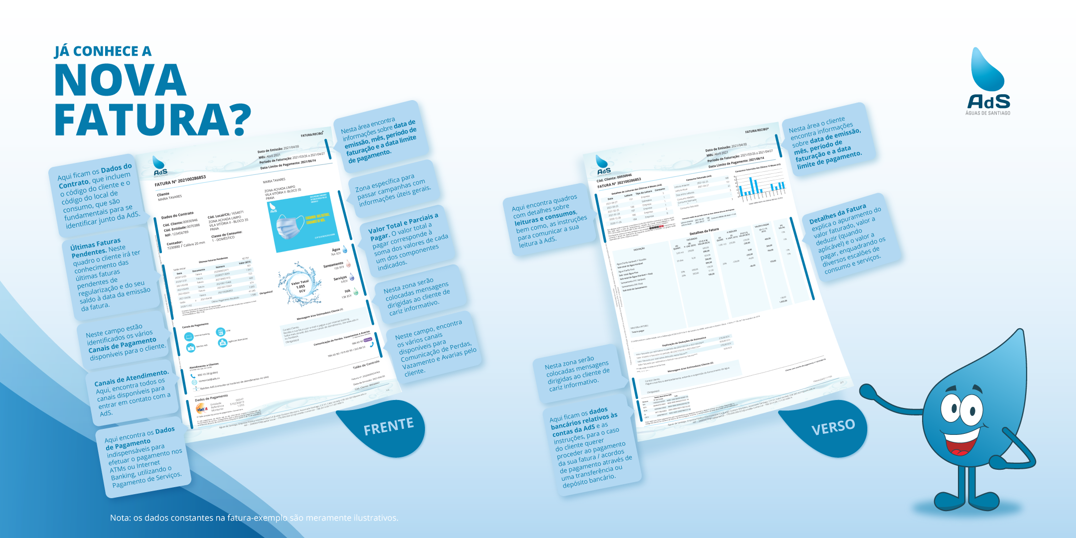 Cumprindo o Regulamento da Fatura-Tipo dos Serviços do Fornecimento Público de Energia, de Abastecimento de Água para o Consumo Humano e de Saneamento de Águas Residuais Urbanas, aprovado pela Agência Reguladora Multissetorial da Economia, por Deliberação nº 35/CA/2019, de 12 de Dezembro, publicada no Boletim Oficial – II Série, n.º 182, de 26 de Dezembro de 2019, vem a AdS informar que no decorrer das próximas semanas será lançada uma nova fatura.